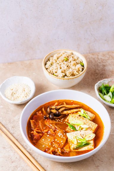 Vegetarisk. Tofu med färska svampar (shimeji, ostronskivling) säsongs grönsaker i doubanjiang och söt chilisås. Servas med ris och vegetarisk ångkokt dumplings (vegofärs, lök, morötter, glasnudlar, vit zucchini och gräslök)